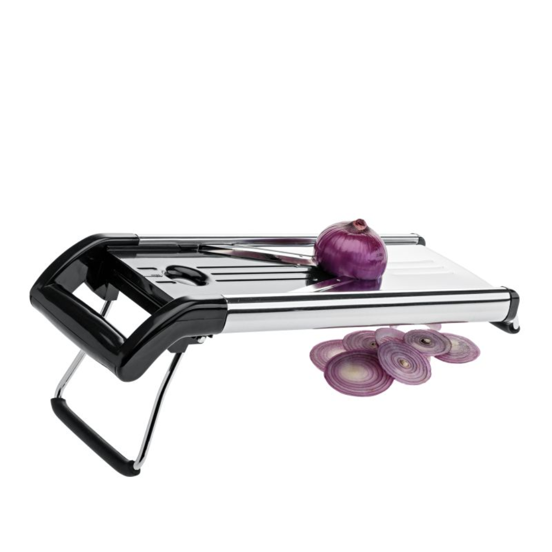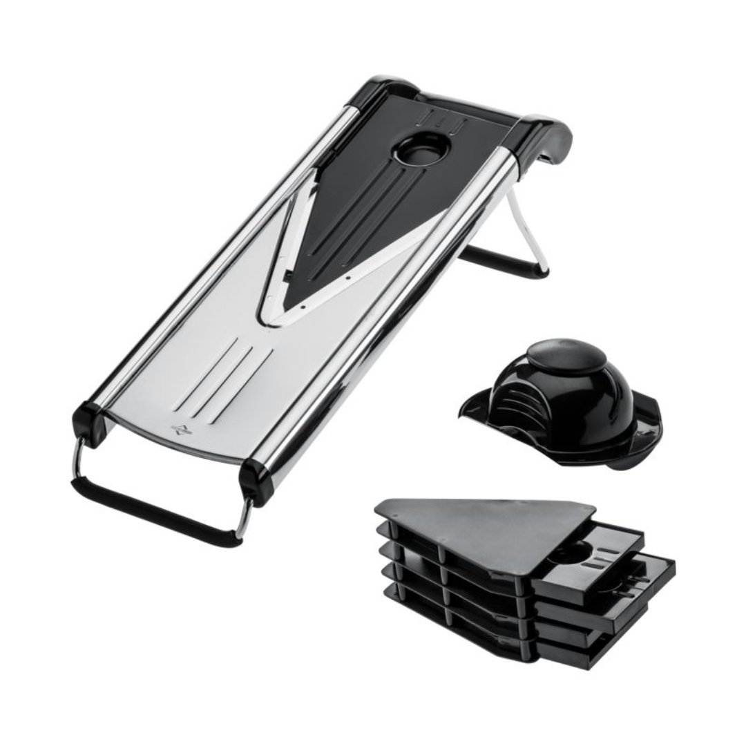 incluye 5 insertos de corte para rebanadas (1,5 mm / 2,5 mm / 3,5 mm) y tiras (3,5 mm / 7,5 mm). Las patas antideslizantes garantizan un funcionamiento seguro.Incluye manual de instrucciones.