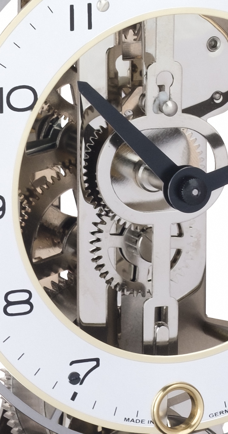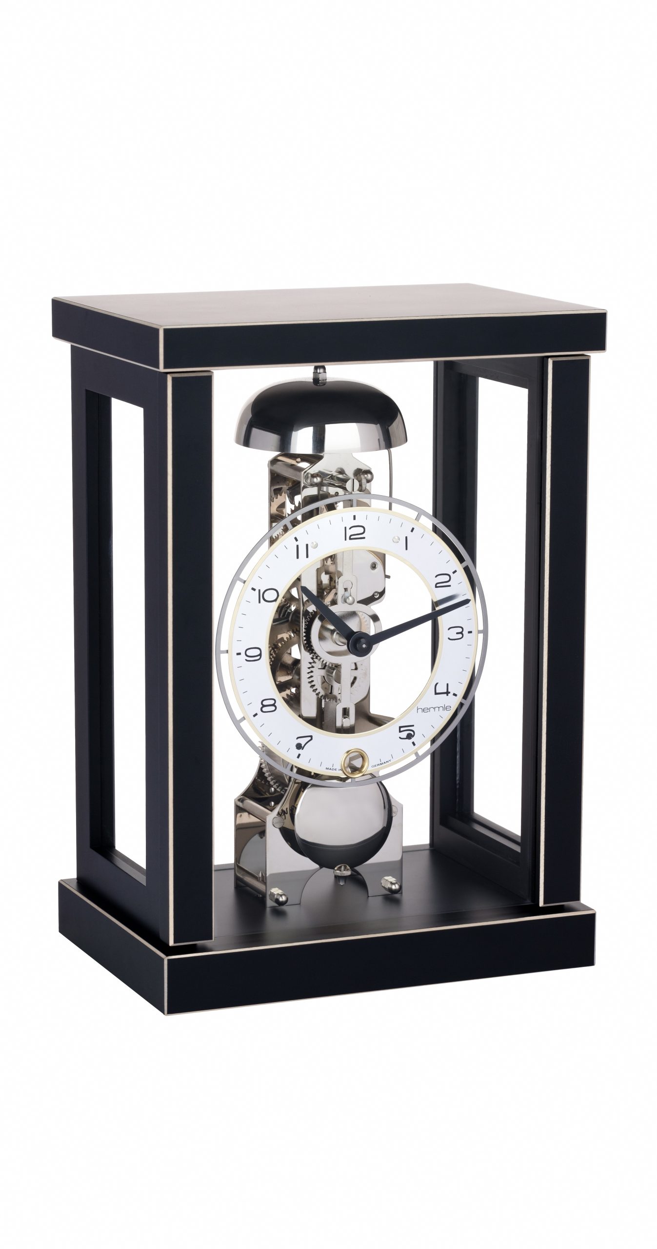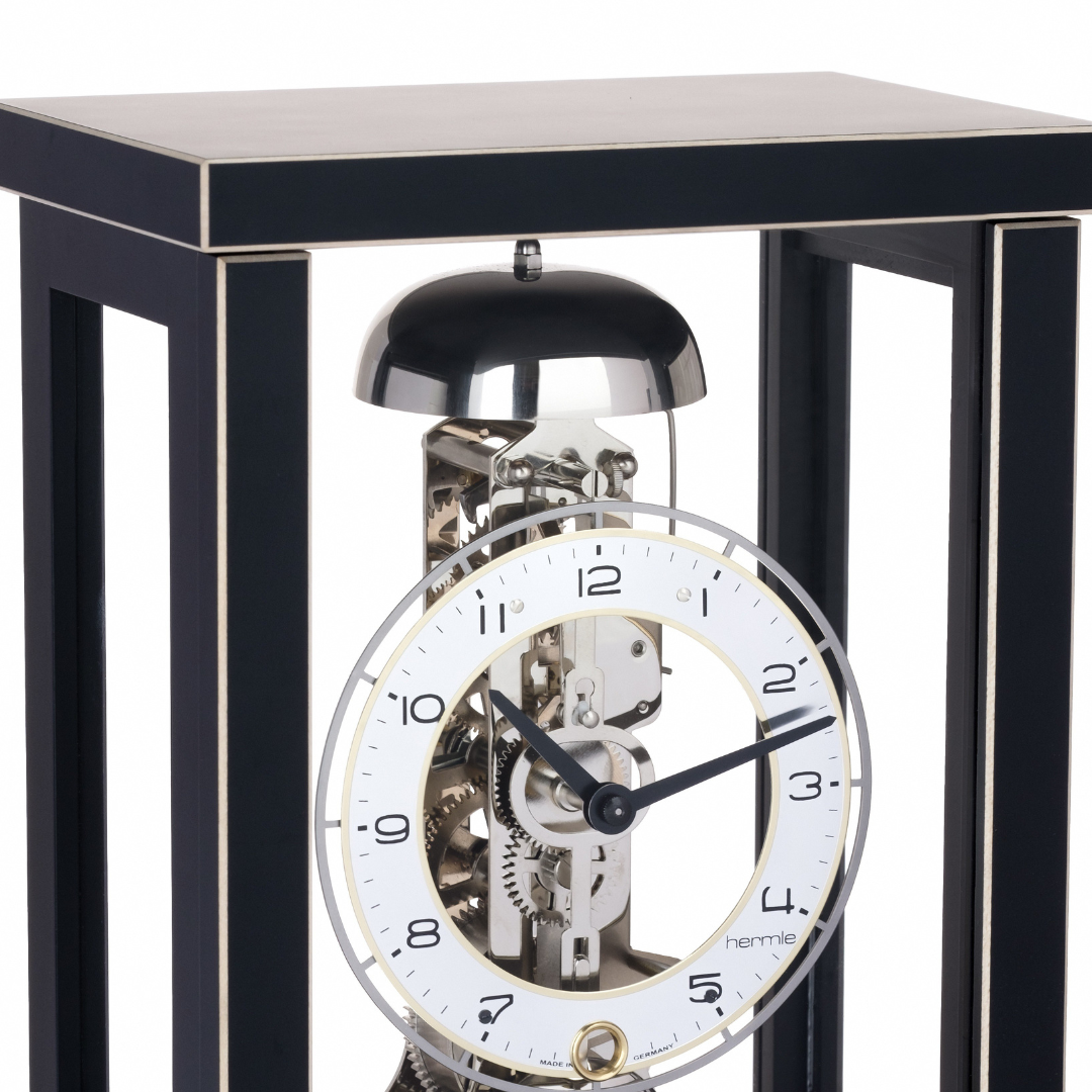Este reloj de de sobremesa proviene de Hermle. De diseño moderno, purista en madera maciza de arce » eisbuche», con acabado en negro una campanada a la hora y su cuerda dura 14 días.