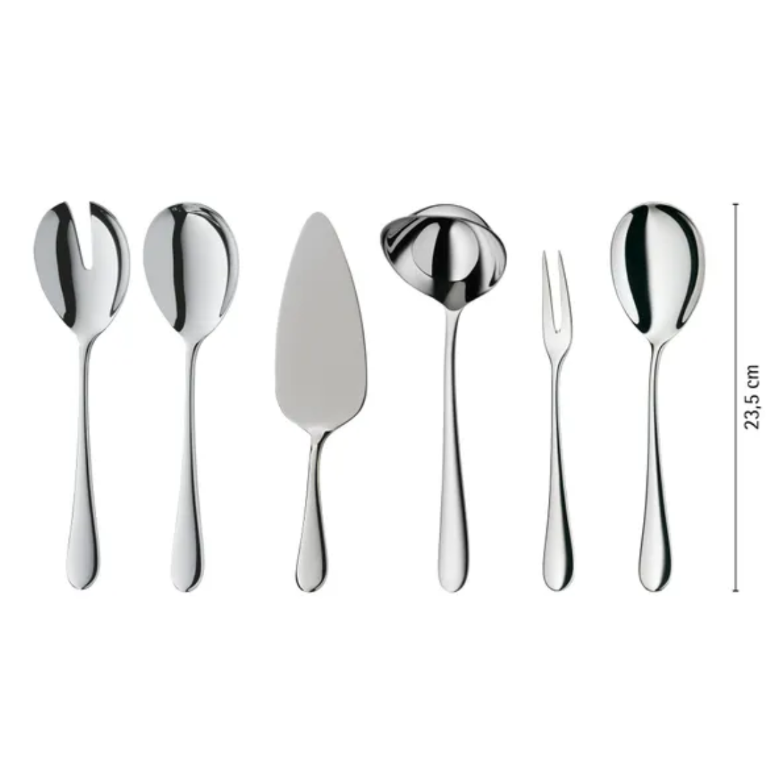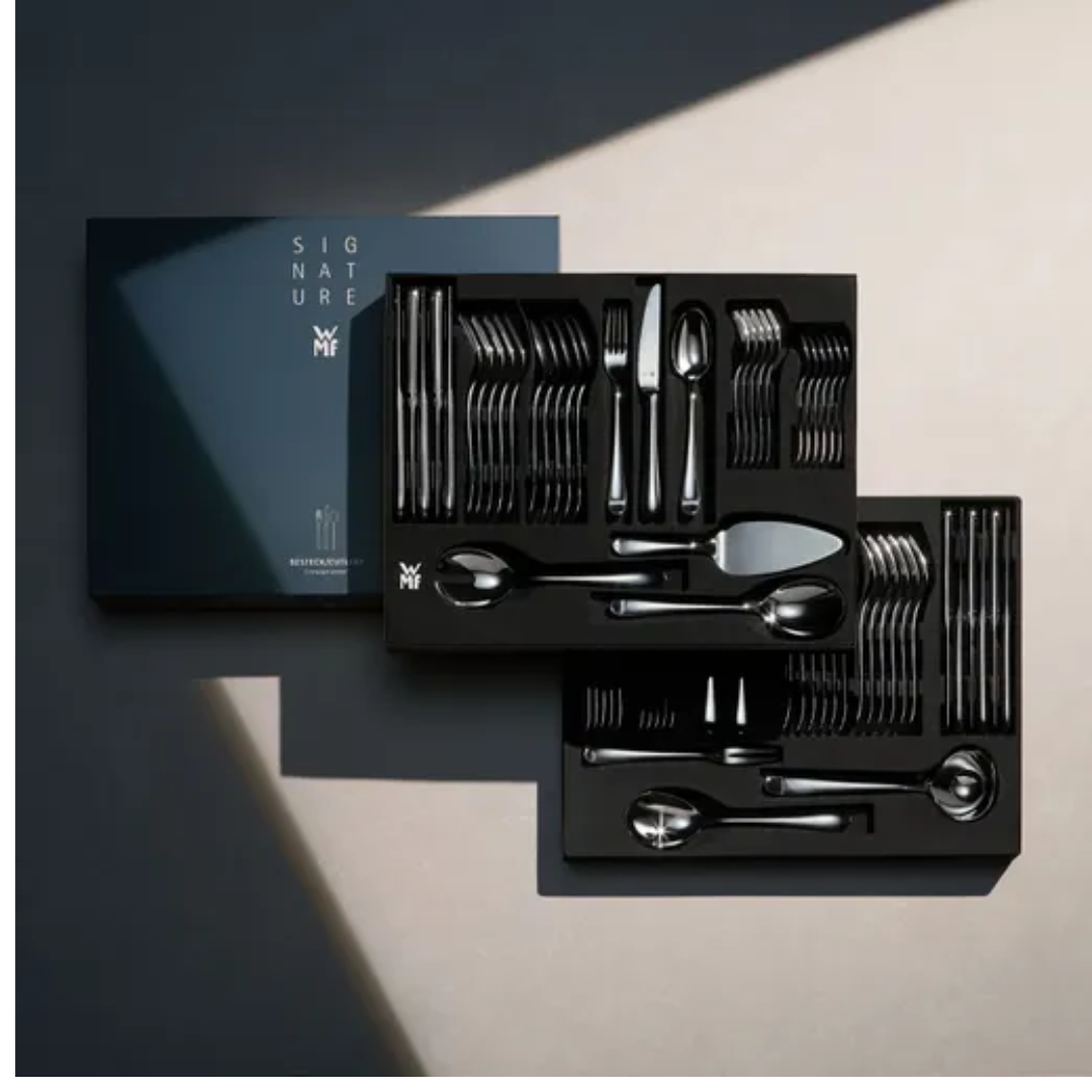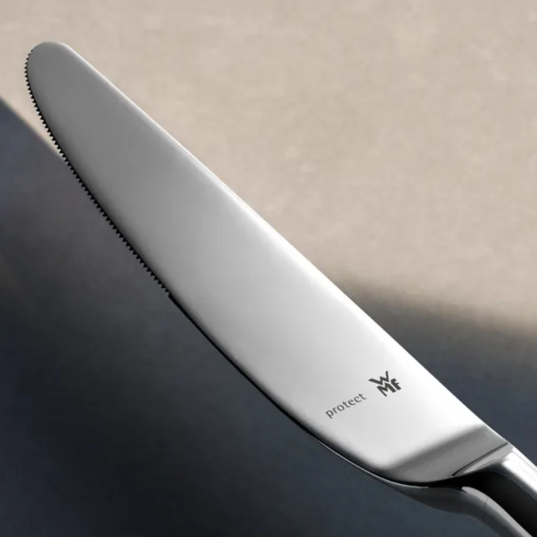 La cubertería Merit de WMF combina con maestría el atractivo de un diseño atemporal con la calidad inquebrantable de los materiales modernos de alta tecnología. El diseño clásico de este juego de cubiertos para 12 personas transmite una sensación de familiaridad, mientras que su meticulosa artesanía, su perfecta ergonomía y su práctico uso diario satisfacen todas las necesidades. Merit también cuenta con el proceso de endurecimiento patentado Cromargan Protect®, que garantiza una resistencia excepcional y duradera a los arañazos y al desgaste. Las hojas con incrustaciones están fabricadas con acero especial inoxidable, forjado y endurecido para un afilado y una flexibilidad duraderos. Con un equilibrio perfecto entre mango y hoja, cada cuchillo de mesa ofrece una sensación cómoda y se adapta perfectamente a la mano. El juego de cubiertos Merit es apto para lavavajillas para una limpieza sin esfuerzo y se entrega en una caja de alta calidad para un almacenamiento seguro y práctico.
