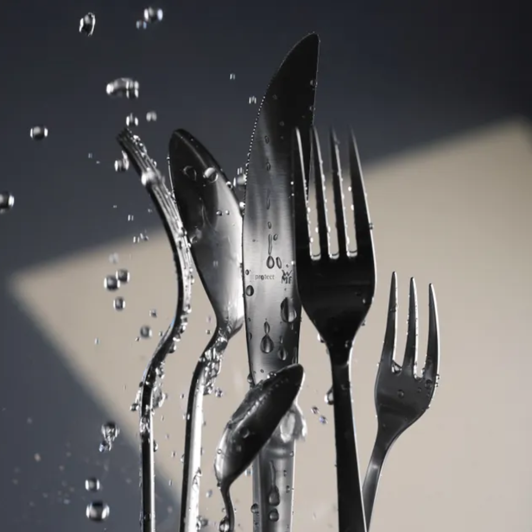 Todos los cubiertos Con Protec para ser mas resistentes a las ralladuras y signos del uso diario, material de acero inoxidable 18/10 Cromargan Protec