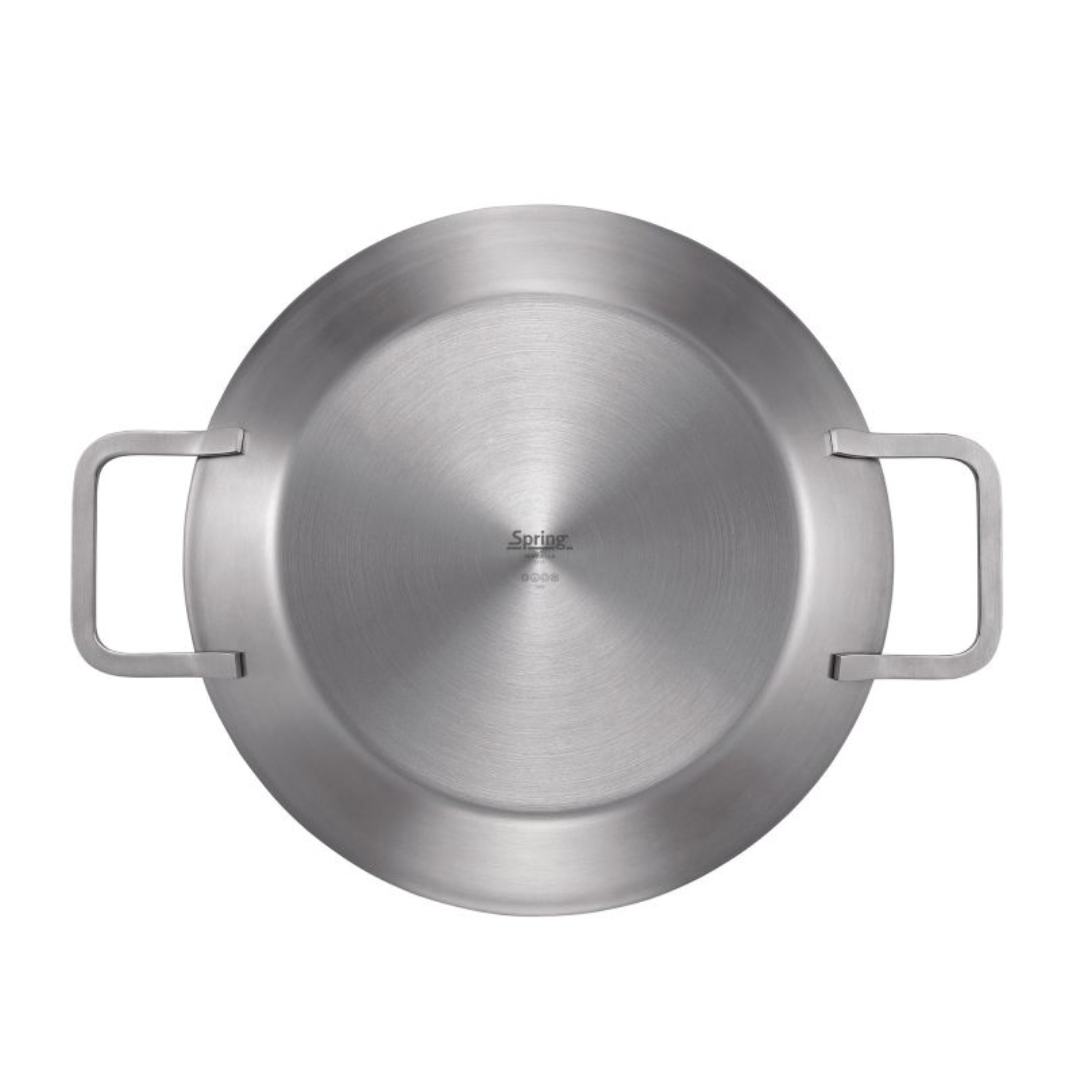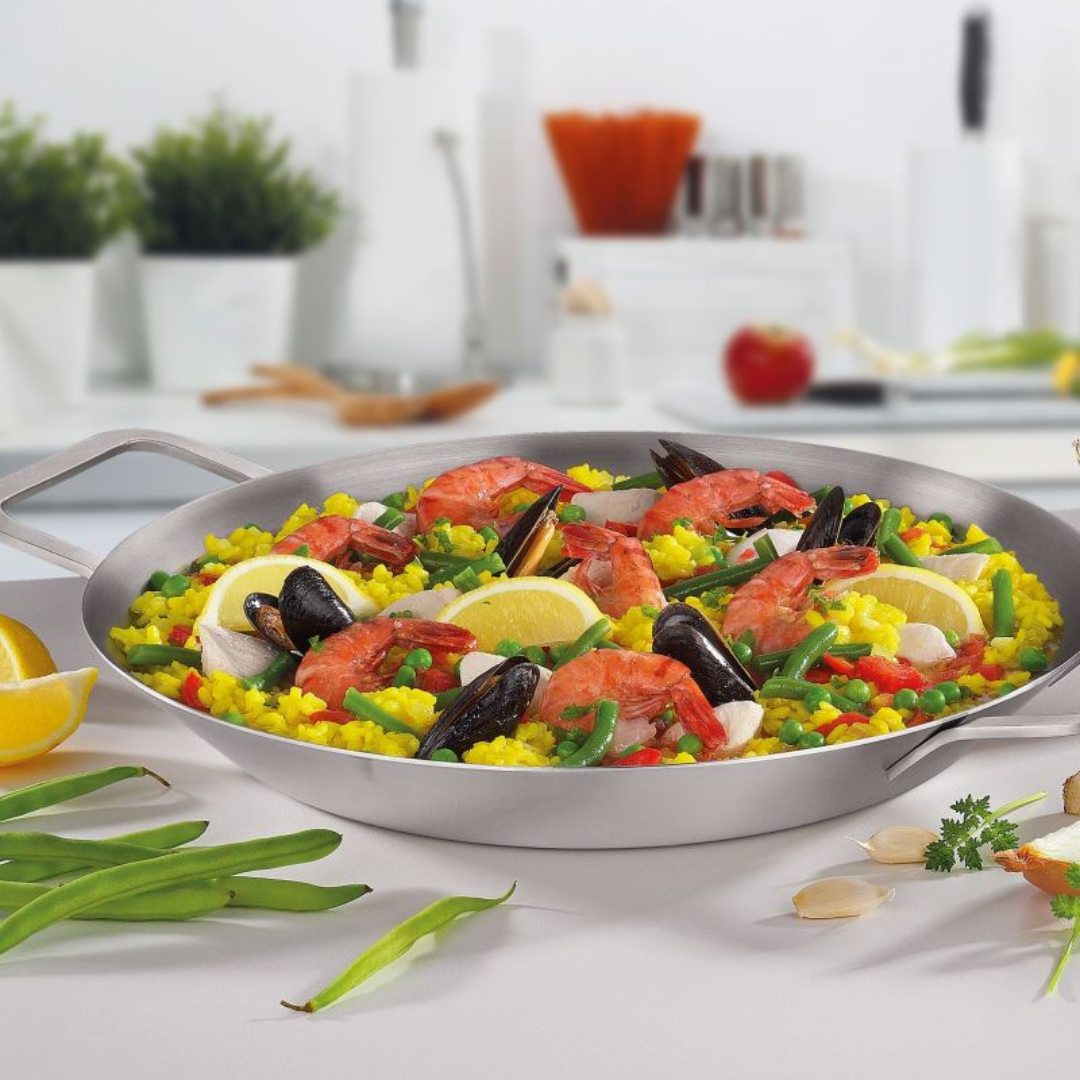 La carne y el marisco se sellan, se añaden las verduras, y el arroz, el azafrán y el caldo encuentran su sitio en la paellera MARBELLA de SPRING. Su material multicapa de eficacia probada garantiza una distribución óptima del calor desde la base hasta el borde y responde rápidamente a los cambios de temperatura. Una vez que se forme la característica corteza crujiente de la paella en el fondo, es hora de disfrutar de esta especialidad española. Gracias a sus asas robustas y ergonómicas, la paellera se puede servir directamente en la mesa, vaciándola ración a ración. Ya sea a mano o en el lavavajillas, la paellera se limpia rápida y fácilmente y está lista para su próximo uso.